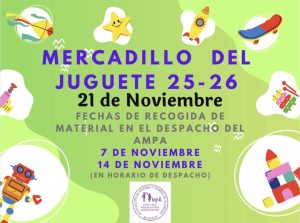 Vuelve el MERCADILLO DEL JUGUETE, organizado por el AMPA del cole. Este tendrá lugar el 21 de noviembre.